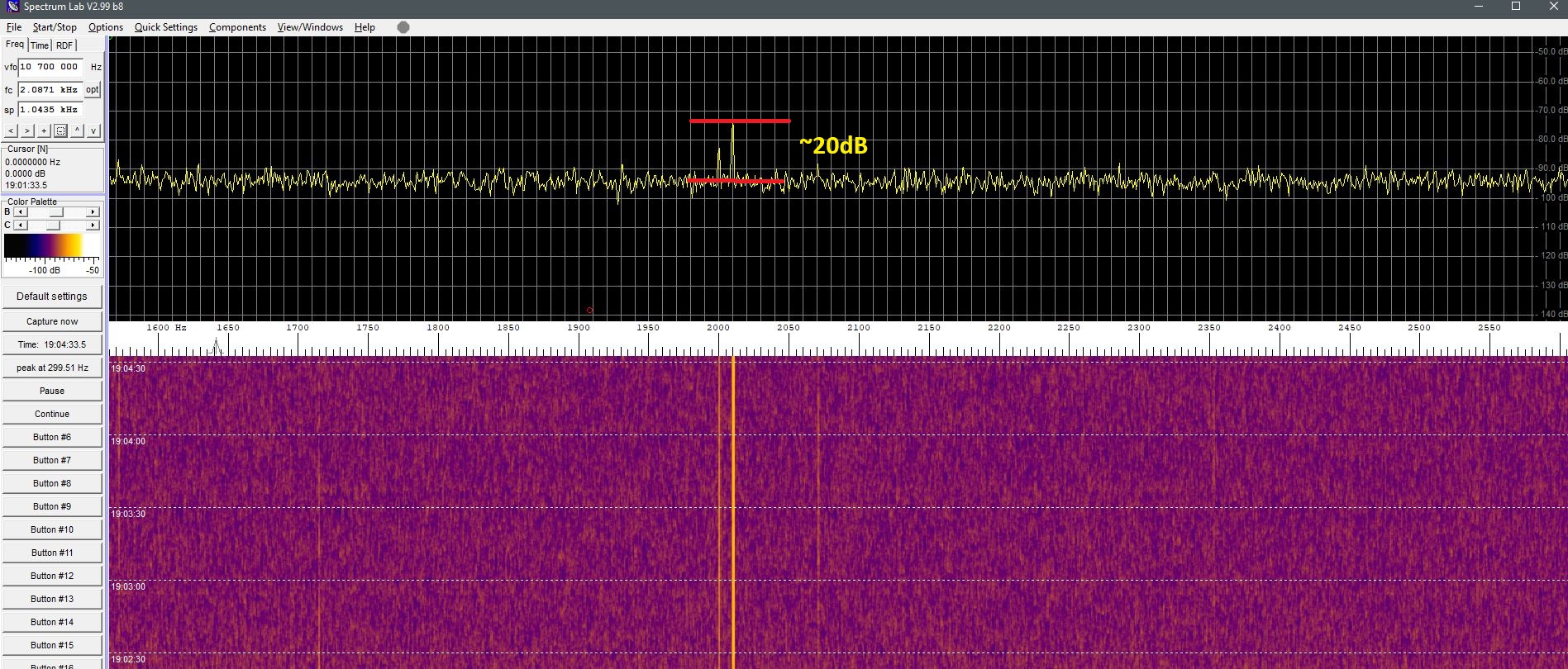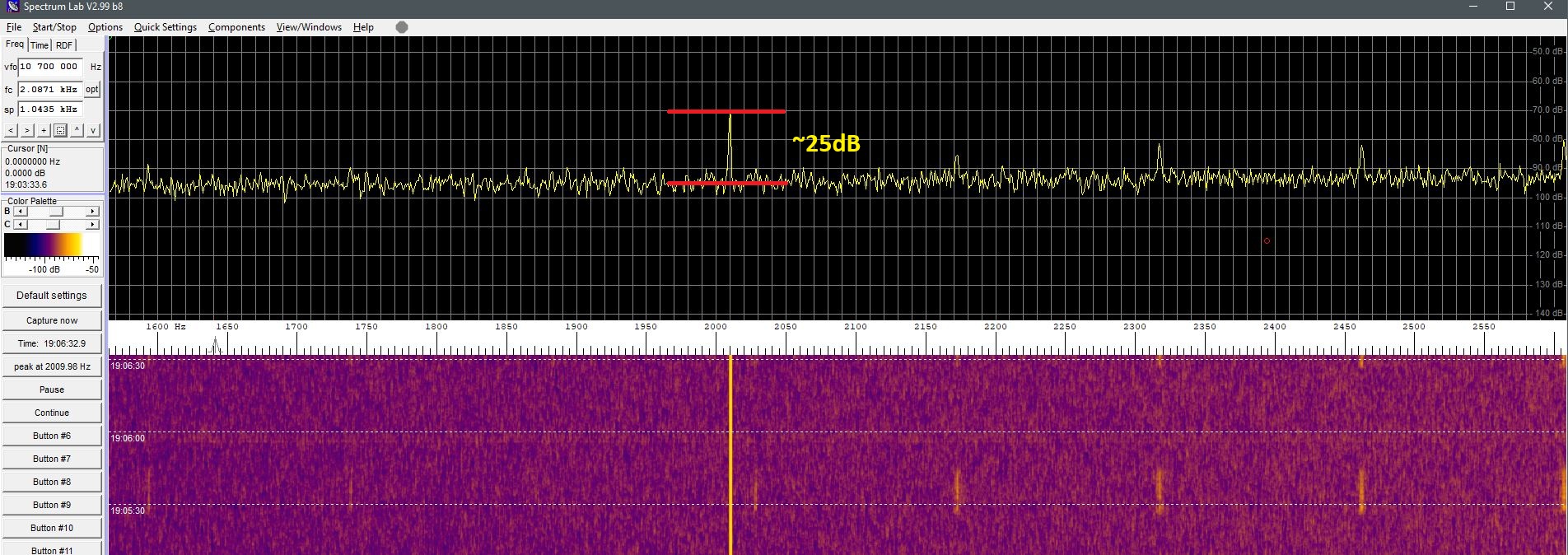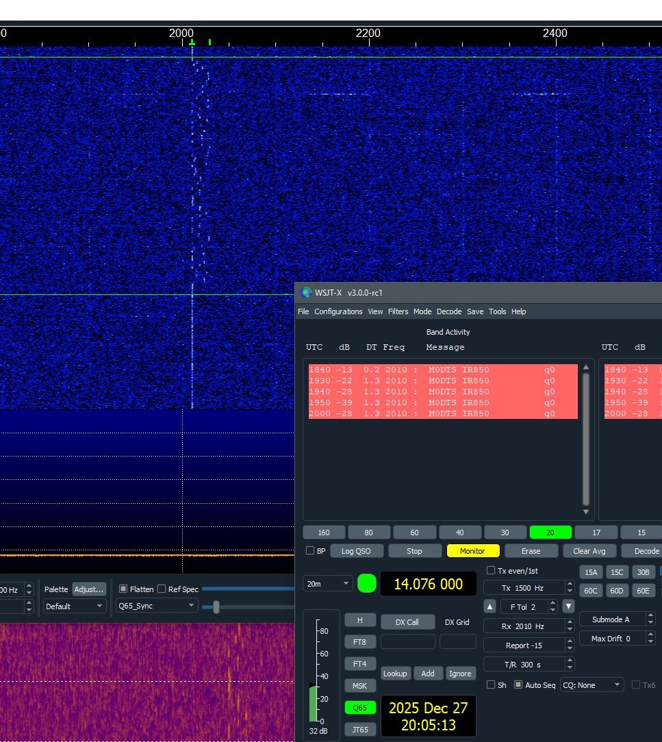 Here’s a screenshot of the decoded Q65 signal, it is not as reliable as i had hoped, the SNR varies a lot with stable signals and does not decode down as low snr as i had hoped… not sure why yet.